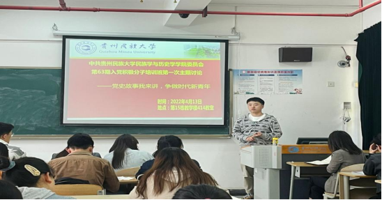 委员会在花溪区第15栋414教室开展第63期入党积极分子培训班第一次主题讨论会,学院组织员、党委委员何慧琳老师围绕“党史故事我来讲,争做时代新青年”的主题展开,以分组讨论选派代表发言的形式进行,特邀学院吴桐老师为讨论会做点评和总结。