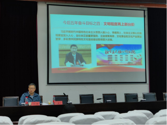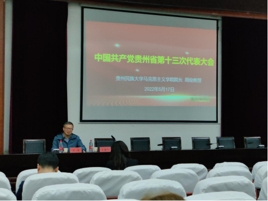 、社会学院、音乐舞蹈学院各支部党员于2022年5月17日晚上19:30在15栋教学楼圆形会议室开展2022年上半年党员培训班第三次党课学习。本次会议由马克思主义学院院长周俊同志进行授课,授课内容为学习贵州省第十三次党代会精神。