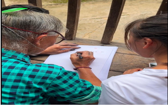 图为实践团成员教村民习字