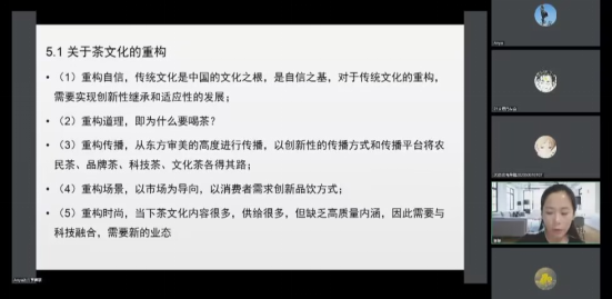 最后,孙娜娜博士讲述了关于茶文化的五个重构:一是重构自信,传统文化是中国的文化之根,是自信之基,对于传统文化的重构,需要实现创新性继承和适应性的发展;二是重构道理,即为什么要喝茶;三是重构传播,从东方审美的高度进行传播,以创新性的传播方式和传播平台将农民茶、品牌茶、科技茶、文化茶各得其路;四是重构场景,以市场为导向,以消费者需求创新品饮方式;五是重构时尚,当下茶文化内容很多,供给很多,但缺乏高质量内涵,因此需要与科技融合,需要新的业态。