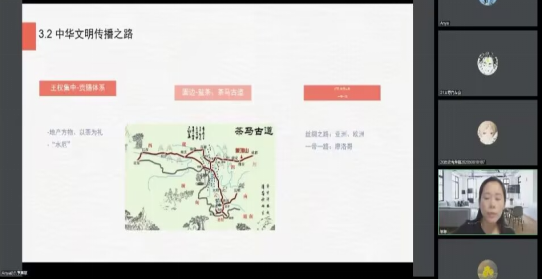 其次,孙娜娜博士提到关于中国茶的状况和发展过程中的重要节点。首先说到茶叶的起源和相关争论,特别是茶起源于印度的争论作了相关说明,随后提到“英式下午茶”和“波士顿倾茶事件”。紧接着说了茶在中华文明传播之路的历程以及茶马古道,解释了“水厄”事件,并提到茶在日本和韩国的发展,特别说明了茶在韩国的发展历程,内容提到茶旅、茶庆典、茶博会和现代化茶产业的发展,涉及群体非常广泛,注重茶礼节。