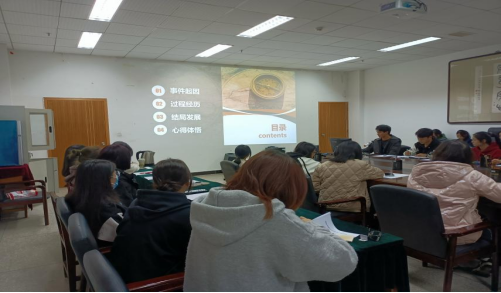 共有四组同学进行了汇报分享。第一阅读小组由廖鹏飞、何奕成、罗宝、陈小东、谢亚飞组成,由廖鹏飞作为代表进行汇报。汇报以《读近代中国经济发展有感》为主题,主要包括事件起因、过程经历、结局发展、心得体会4方面内容。