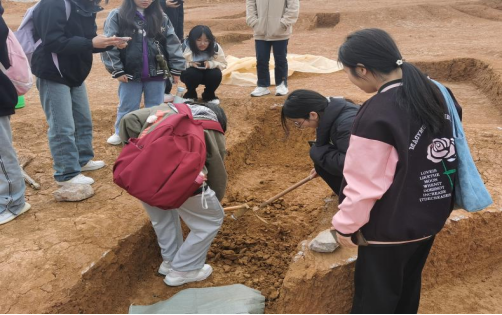 参观大松山墓葬群考古发掘现场时,同学们对于发掘墓葬这一工作十分好奇,大家仔细观看了现场考古人员发掘墓葬的每一个步骤和具体操作。与现场考古发掘人员进行了交流,让我们对于考古发掘有了一个更清晰的认识;在考古发掘现场的工作人员同意下,同学们轮流参与了发掘墓葬这一工作,对于发掘墓葬进行了亲自动手的体验。