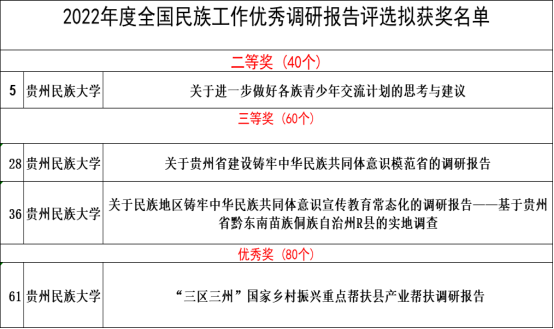 郝亚明教授主持的《关于民族地区铸牢中华民族共同体意识宣传教育常态化的调研报告》荣获调研报告“三等奖”。学院刘苏荣教授主持的《“三区三州”国家乡村振兴重点帮扶县产业帮扶调研报告》荣获调研报告“优秀奖”。