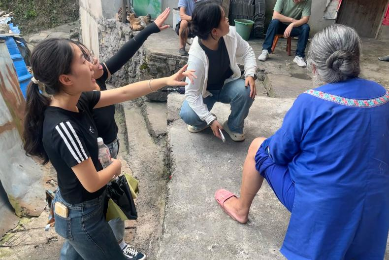 在走访过程中,团队成员遇见正在门前专注刺绣的侗族村民。据村民介绍,当地侗族服饰分为日常与盛装两种制式:日常夏装以蓝色为主色调,穿着轻便;黑色盛装则在冬季与重大节庆时穿戴,配以传统银饰,更显端庄大气。