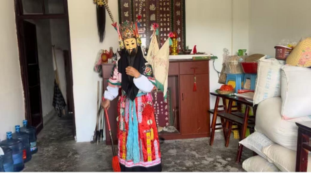 一方小小的堂屋,观众寥寥无几,这场演出也并不正式,没有华丽的舞台,没有绚丽的灯光,更没有热烈的掌声与喝彩。然而,我却从叶老师的身上,真切地感受到了一位表演者对地戏的热爱与尊重。上一秒,他还在认真地准备道具,仔细检查每一个细节;下一秒,便已然全身心地沉浸于地戏的世界之中。