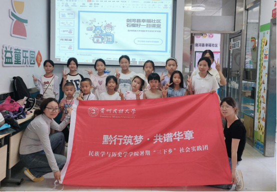 黔行筑梦·共谱华章实践团在剑河县幸福社区开展了“石榴籽一日课堂”。2024年6月,习近平总书记在青海考察时提出:“要讲好中华民族共同体和民族团结进步的故事,把中华民族共同体意识从小就植入孩子们的心灵。”实践团牢牢领会习近平总书记重要讲话精神,以铸牢中华民族共同体意识为课堂核心,通过语言互动与趣味游戏,让孩子们学习国家通用语言文字,在互动中增进民族团结意识。