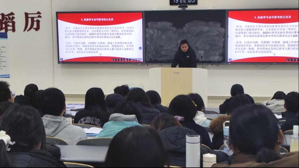 于第一教学楼202教室面向2023级学生举办就业规划专项指导会,学院党委书记李浩、辅导员刘欢歌出席此次活动。特邀黑板教育张昌成老师,聚焦学生考公需求,系统解析备考规划与实战策略,提供针对性指导。