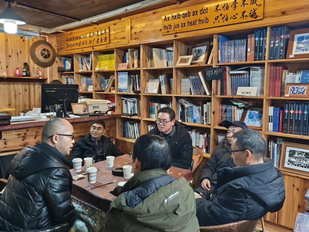 西江苗寨教学实践基地进行实地考察。在学院、地方党委政府、景区公司的大力支持下,该基地于2016年创办,长期致力于民族文化的挖掘、研究、传承与产学研一体化发展,同时开展民族文化旅游研究与人才培训工作。团队先后参观了基地内的西江书局与西江讲堂。在西江书局,调研人员浏览了基地多年来收集、整理及出版的丰富地方文献、学术著作与文化读物,对其在文献保存与知识传播方面所做的扎实工作表示赞赏。在西江讲堂,基地学生陆群艳向调研组详细汇报了基地自成立以来的发展历程、主要开展的田野调查项目、文化交流活动以及服务地方社会的具体实践,展现了其连接高校学术与地方田野的桥梁作用。